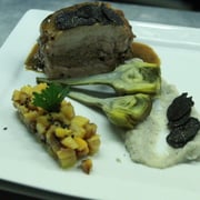 Gigot d'agneau, sauce quercy, polenta truffée et légumes d'antan.
